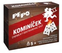 PE-PO kominíček - přípravek k odstraňovaní sazí z komínů a kouřovodů, zlepšuje hospodárnost provozu kamen a kotlů a působí preventivně proti vzniku požárů způsobených vznícením sazí v kouřovodech.