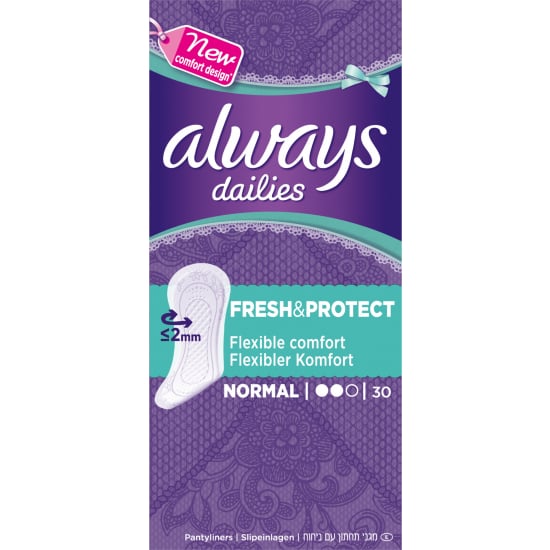 Intimní slipové vložky Always Fresh & Protect Normal nabízejí díky pohodlnému designu skvělou kombinaci komfortu a ochrany. Zůstanete celý den svěží, můžete se na ně spolehnout každý děn, aniž byste je ucítila. Ideální pro vaginální výtok nebo větší ochranu při nepravidelné menstruaci.