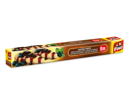 Fino papír na pečení 8 m x 38 cm má speciální silikonovou nepřilnavou vrstvu. Je oboustranný a použitelný na jakoukoliv formu nebo plech.