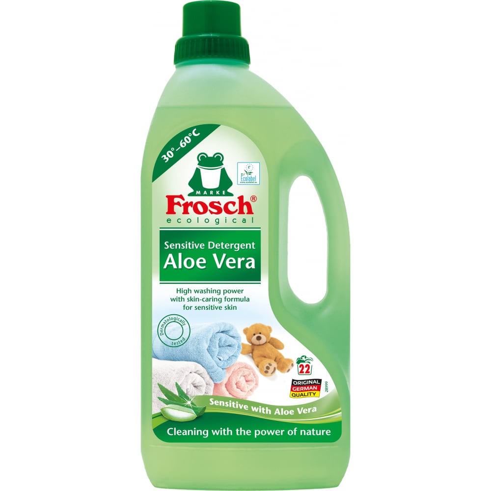 Frosch aloe vera obsahuje optimalizovaných systém aktivních látek a poskytuje silnou, avšak k pokožce šetrnou čisticí sílu bez přidání barviv a konzervačních prostředků. Je vhodný pro ruční praní díky své šetrnosti k pokožce. Prací prostředek obsahuje výtažek z listů aloe vera, který je známý svým hojivým účinkem. Šetrnost k pokožce je dermatologicky testována.