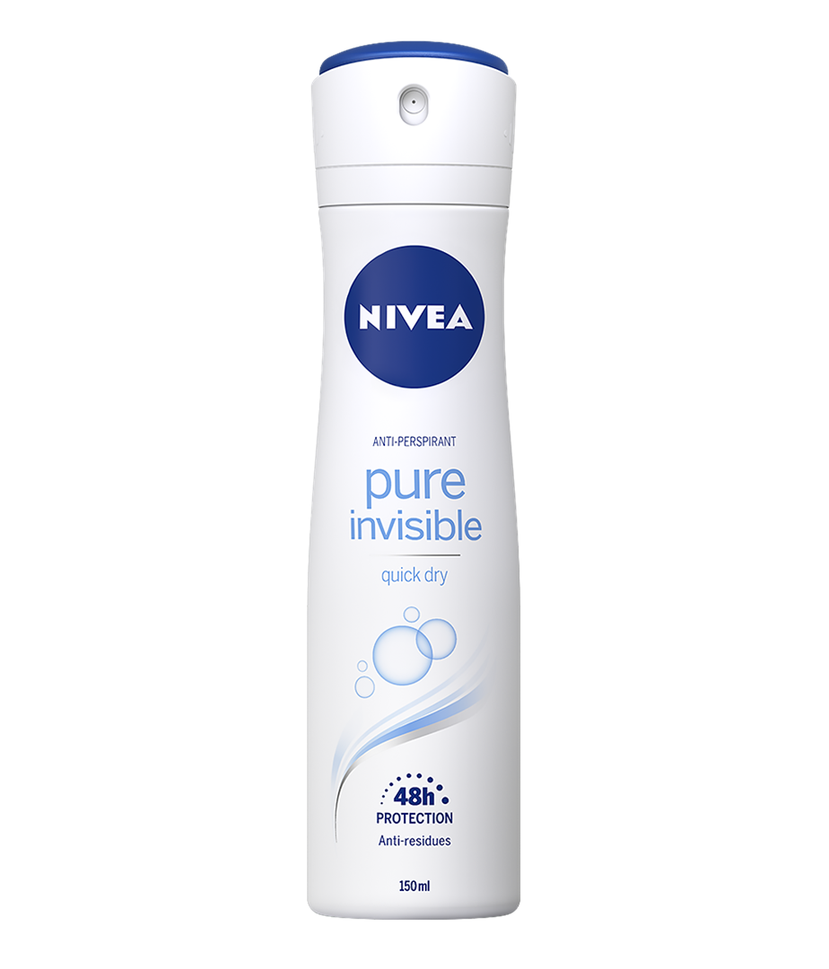 Chcete se zbavit nepříjemného pocení? Udělejte to bez bílých stop na pokožce i šatech! Nejúčinnější složení bez alkoholu* redukuje pocení až po dobu 48 hodin. Obklopte se jedinečným pocitem čistoty, péče a lehké svěží vůně. NIVEA Sprej antiperspirant Pure Invisible.