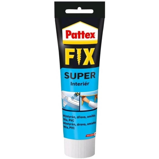 Pattex FIX Super je montážní lepidlo k lepení porézních materiálů pro použití v interiéru. Lepí lehké a savé materiály, např. dekorativní desky, polystyrenové prvky, dřevěné desky a zárubně apod.