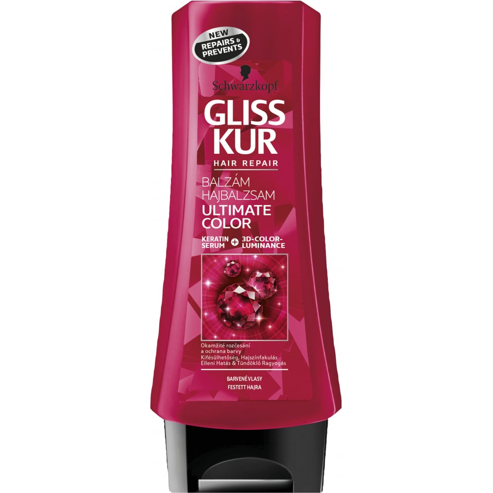 Receptura Gliss Kur s keratin sérem regeneruje již vzniklá poškození a předchází budoucímu poškození. Ultimate Color balzám pro barvené, tónované nebo melírované vlasy s technologií 3D-Color-Luminance uzavírá a posiluje vlasová vlákna. Pro perfektní rozčesatelnost, zářivost a ochranu barvy až na 12 týdnů (při použití v kombinaci se šamponem).