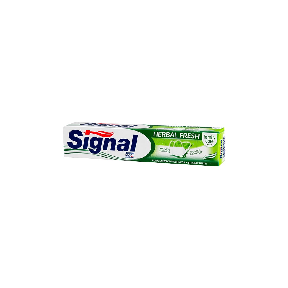 Dlouhotrvajcí svěžest. Zubní pasta Signal Family Herbal Fresh obsahuje bohatou směs přírodních výtažků, mezi kterými jsou máta, šalvěj, myrha a eukalyptus, známé pro jejich osvěžující vlastnosti. Aktivně bojuje proti nepříjemnému dechu a zanechává v ústech dlouhotrvající pocit svěžesti. Silnější zuby chráněné proti zubnímu kazu. Signal Family Herbal Fresh pomáhá doplňovat zubům fluor a vápník, nejdůležitější prvky pro udržení silných zubů.