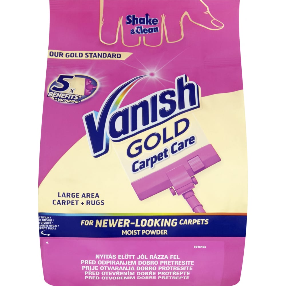 Vanish Shake & Clean vlhký prášek na čištění koberců 650 g. Prášek je výborný na koberce a čalounění. Důkladně vyčistí koberec, odstraní odolné skvrny, zápach a zažranou špínu zachycenou hluboko ve vláknech, obnoví koberec a dodá svěžest. Při působení rychle zasychá a cca po 20 minutách je koberec suchý a čistý. Vanish byl vyvinut pro snadné čištění koberců a čalounění v domácnosti.
